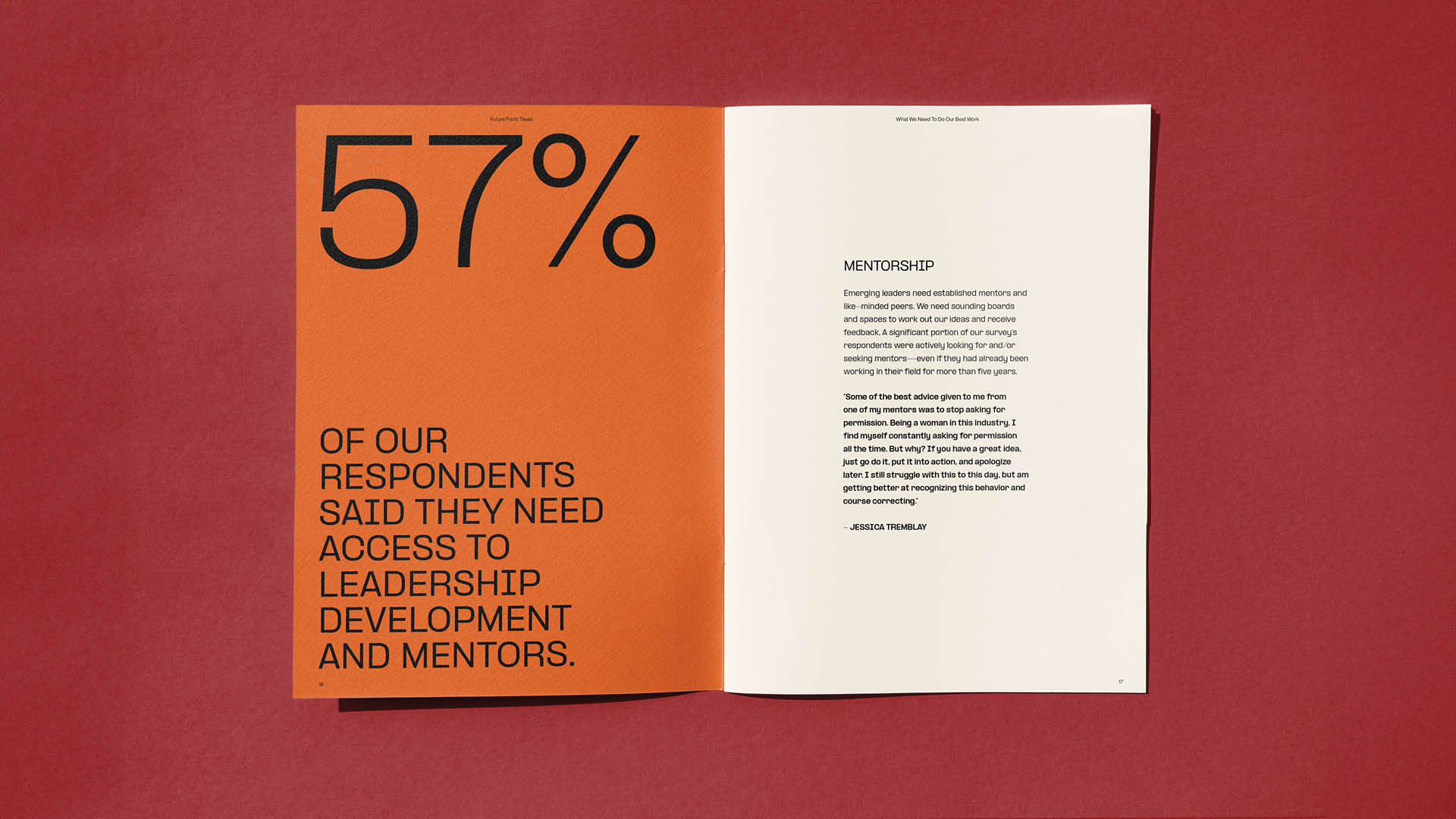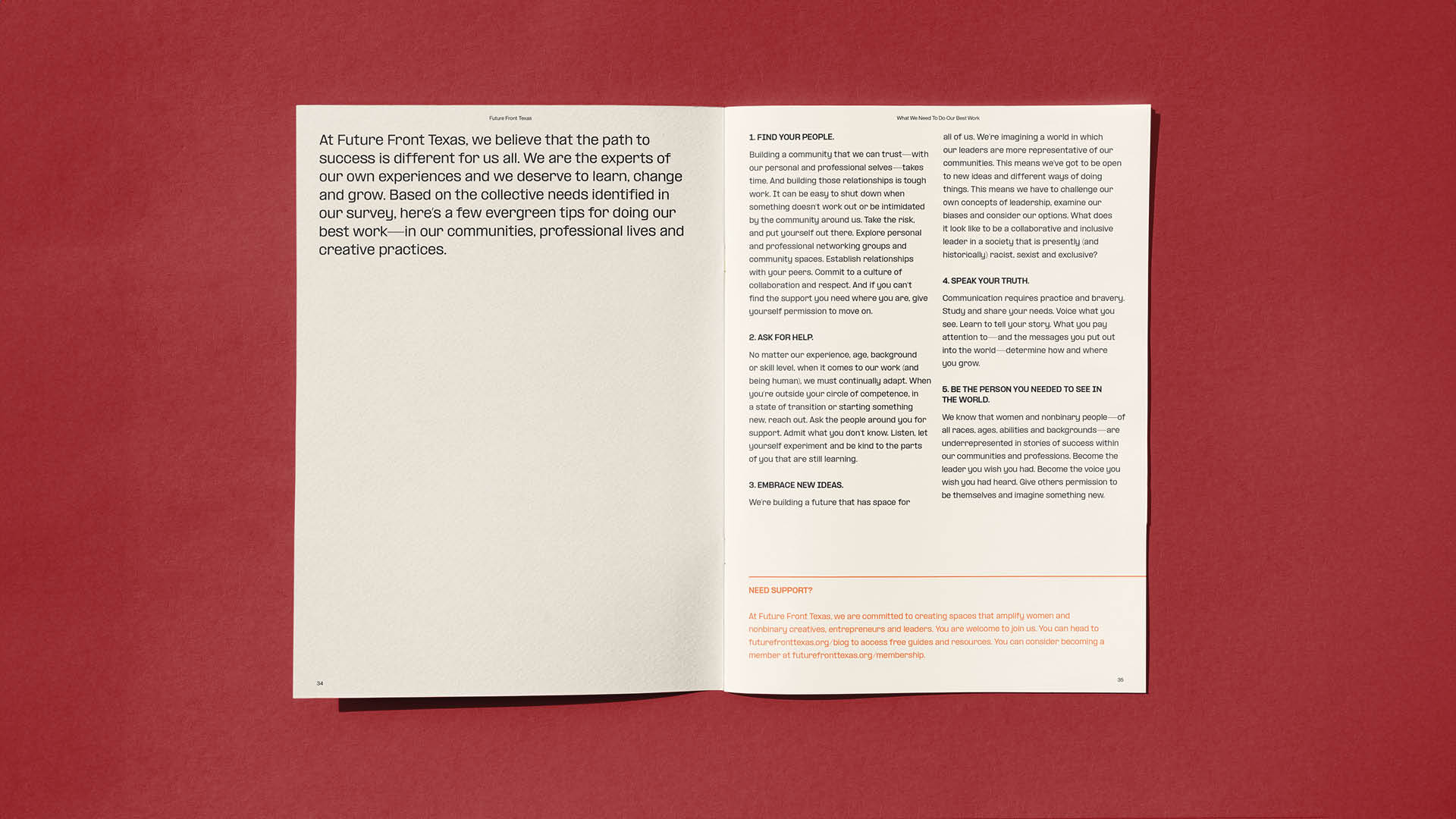 What We Need to Do Our Best Work visualizes a 2019 study conducted by the Future Front Texas team on the needs of the community. It combines qualitative and quantitative data into a comprehensive guide featuring interviews and photos of prominent leaders in the organization’s network. How To Nurture Abundance and Prevent Burnout is a journaling guide providing the reader with daily practices and resources to cope with burnout.
