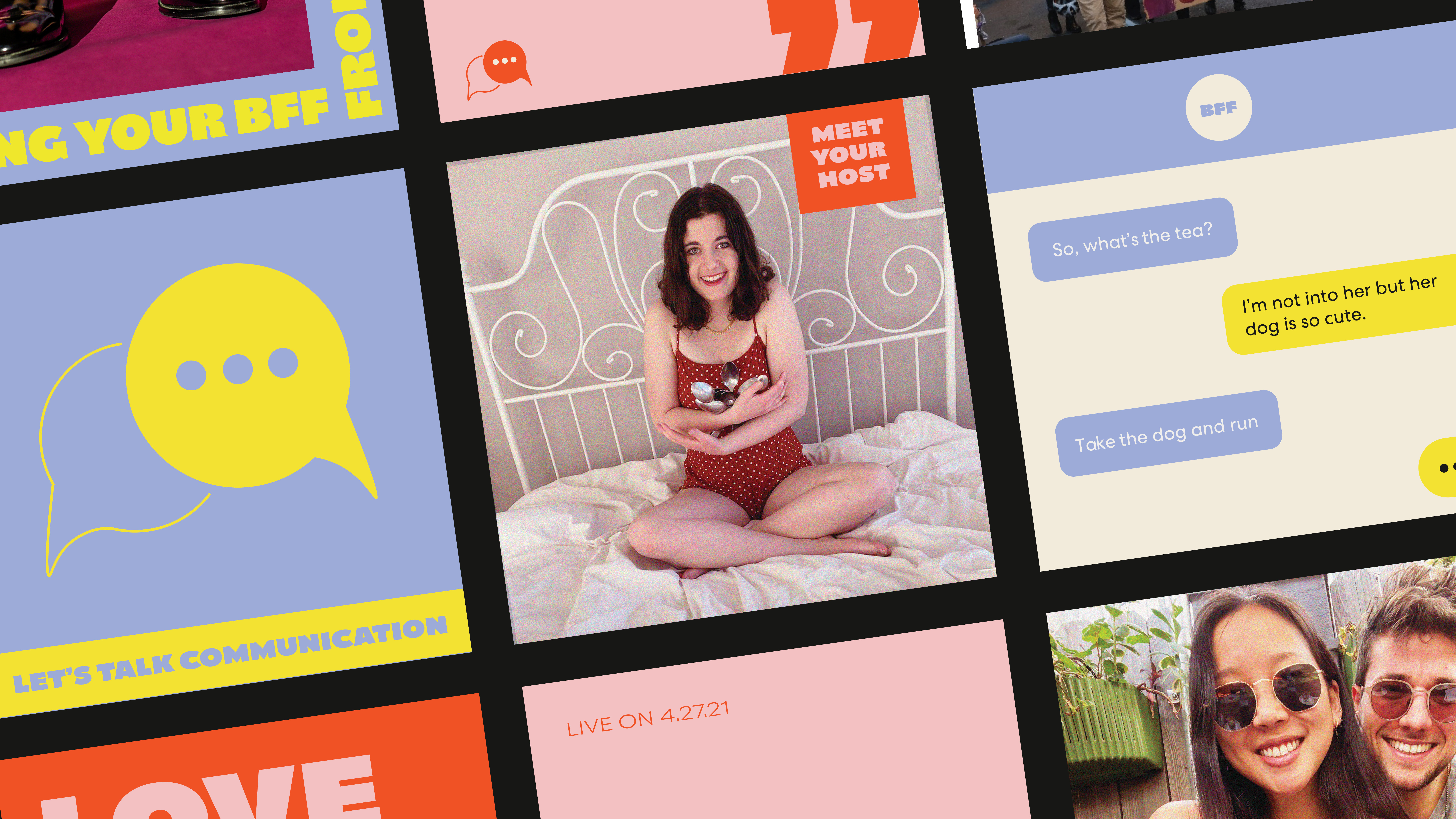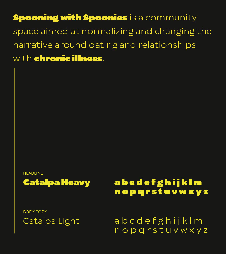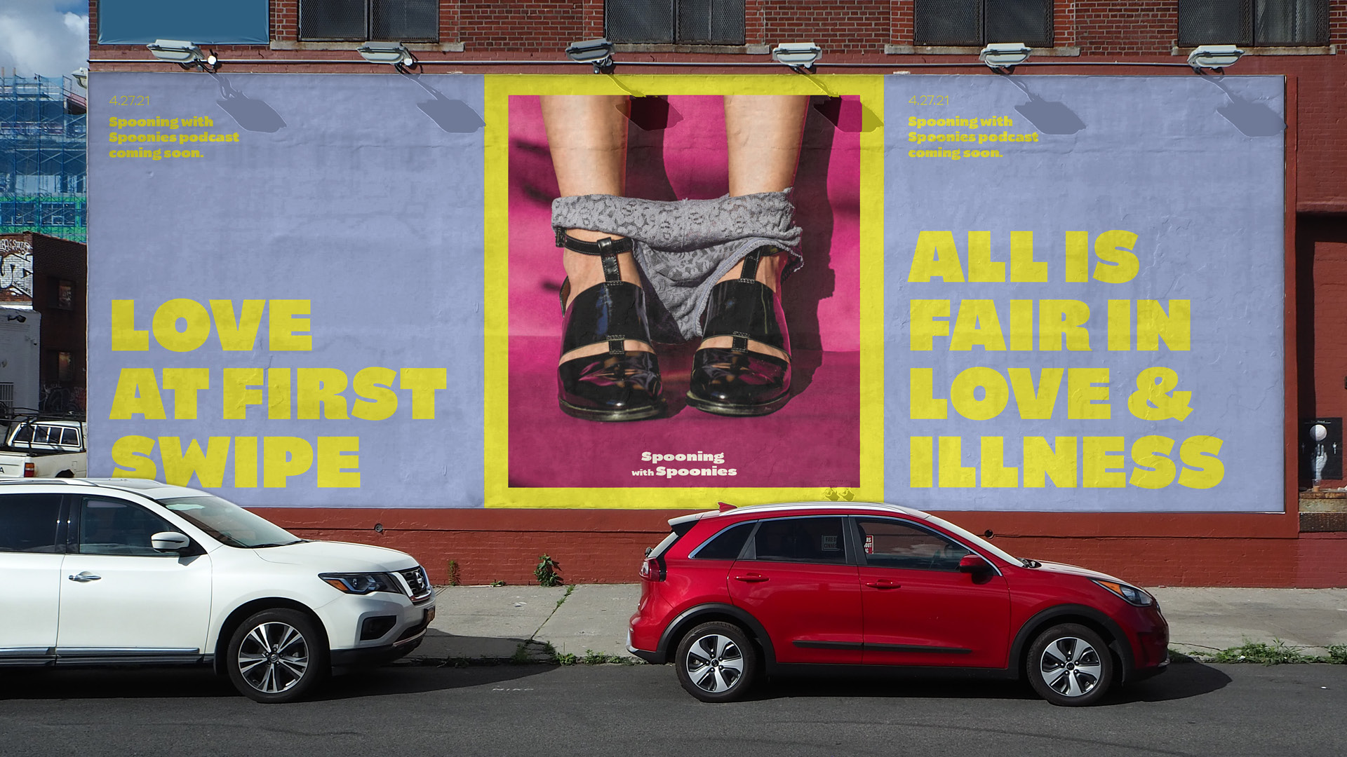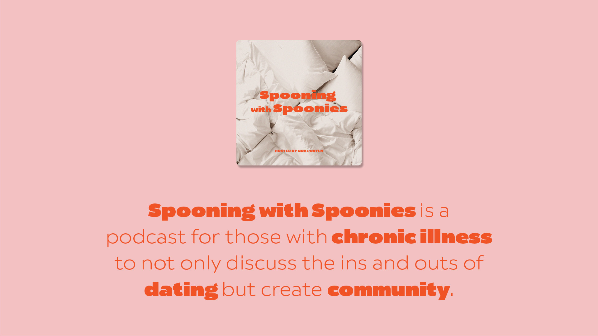 Spooning with Spoonies is a podcast that creates space for people to discuss dating with a chronic illness. The podcast interviews a diverse group of spoonies about their relationships and dating adventures. It highlights host Noa Porten’s story while using social media to facilitate discussion and create a sense of community around these topics. The visual identity of SWS uses bold typography and quirky photography that brings to light an underrepresented topic in an approachable way. Unlike other chronic illness brands, SWS is the opposite of clinical. It plays off of phrases from the dating world/dating apps. It positions Noa as an honest influencer going on her journey along with her audience. While the brand assets direct the viewer back to the podcast, they also create space for conversations among the chronic illness community.